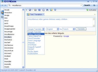 D'autre part, Coolexon Dictionary propose de traduire des textes en entier et en plusieurs langues via la plupart des services de traduction en ligne tels que Google Translate, Yahoo BabelFish ou AltaVista.